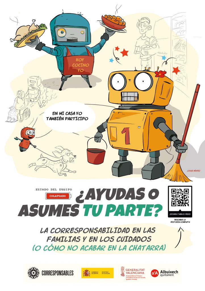 El Ayuntamiento de Albuixech lanza una campaña para fomentar la corresponsabilidad en las tareas del hogar que insta a los hombres a asumir los cuidados y las labores del mismo. Esta campaña, financiada por la Vicepresidencia segunda y Conselleria de Servicios Sociales, Igualdad y Vivienda y el Ministerio de Igualdad aparece bajo la denominación s ‘Corresponsables : No es ayudar, es asumir tu parte” Si quieres, puedes . Albuixech con la corresponsabilidad en las familias. Por la igualdad entre mujeres y hombres’.