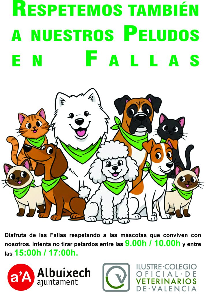 El Ayuntamiento de Albuixech y el Colegio de Veterinarios se unen para fomentar la convivencia entre el estallido de la fiesta y la tranquilidad de nuestras mascotas.